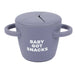 The Happy Snacker is a first-of-its-kind two-piece silicone snack cup with a mess-proof snap-tight lid and soft silicone opening so little hands can easily access food and prevent spills. Designed with easy-grip handles, it fits in car seats and stroller cup holders.