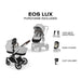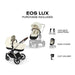 • INCLUDES: EOS Lux Stroller Frame, Seat Fabric Set, Cot Fabric Set, Car Seat Adapters, Bumper Bar, Cup holder, Rain Cover