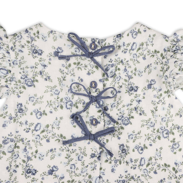 Introducing our Celia Floral Muslin Baby Blouse with Bow Details and Bloomer, crafted from 100% organic cotton Swiss dot muslin, where softness meets elegance in every stitch.