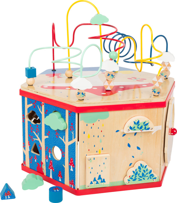 Playtime fun in an exclusive small foot design! This high-quality motor skills cube made of FSC® 100%-certified wood from the "Move it!" product group impresses customers with its high playtime value because there is so much for young explorers to discover: foldable wooden elements in the style of the game "Memory" train children's understanding of numbers, a searching game with a hedgehog, a ladybeetle and a bird provide fun and a seasons clock provides useful knowledge about spring, summer, autumn and winter. A game with small wheels and a large activity loop are the cherries on top of the motor activity fun. And another great thing: this motor skills cube also looks great as a small table or a stool! What side do you want to begin with first?