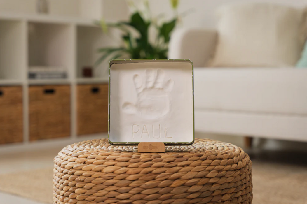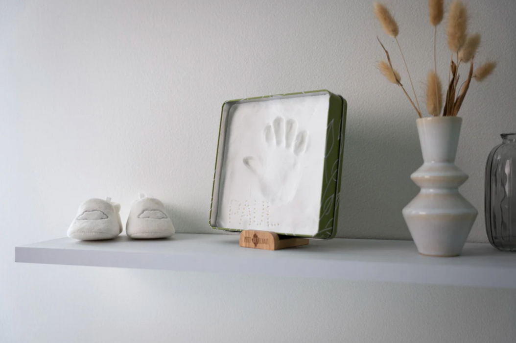 The Baby Box Square - Olive Tree is a square decorative mold that allows you to create a unique and personalized memory of your baby. This pretty metal box allows you to make hand or footprints to immortalize these unique moments. The Baby box square - Olive Tree blends harmoniously with the decor in the child's room or the living room. The Baby box includes a square metal box, a hypoallergenic clay packet, a decorative wooden stand, a wooden roller, and instructions to easily create the print.
